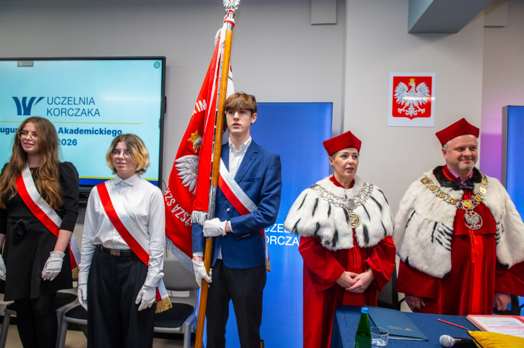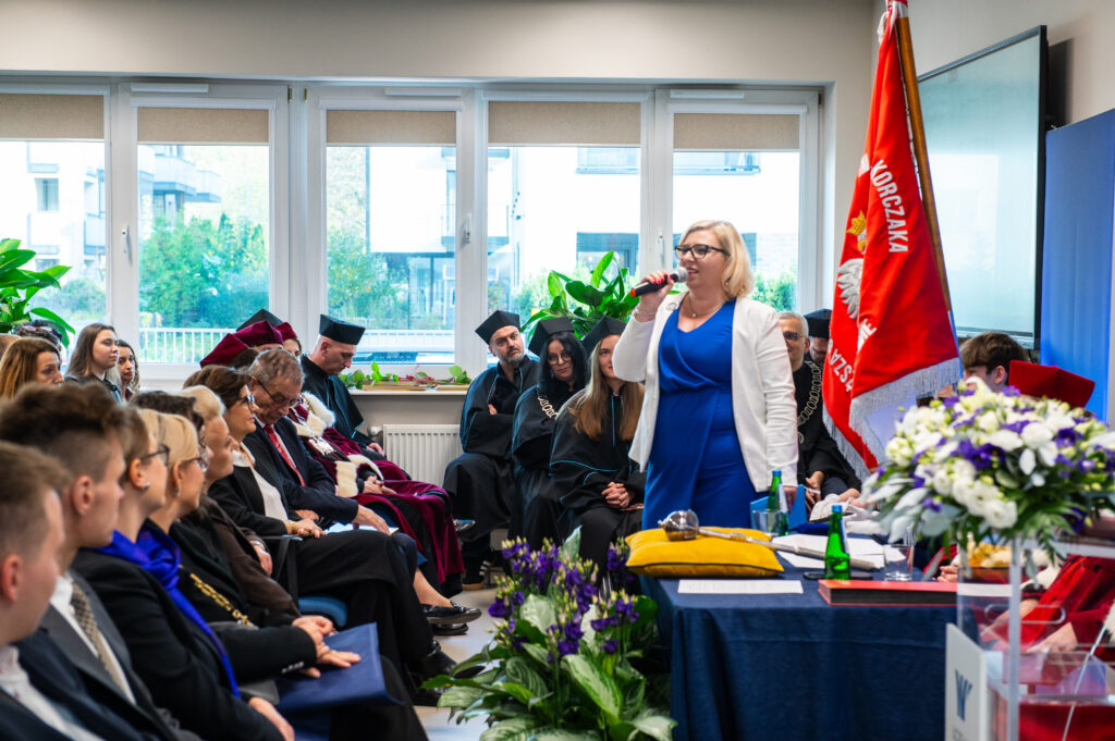 Jednym z najbardziej wzruszających momentów była uroczysta immatrykulacja studentów pierwszego roku. Nowi studenci składając ślubowanie na ręce dr Joanny Lizut, stali się pełnoprawnymi członkami społeczności akademickiej Uczelni Korczaka. W tym symbolicznym momencie zabrzmiało „Gaude Mater Polonia”, a aula wypełniła się poczuciem wspólnoty i nowego początku.