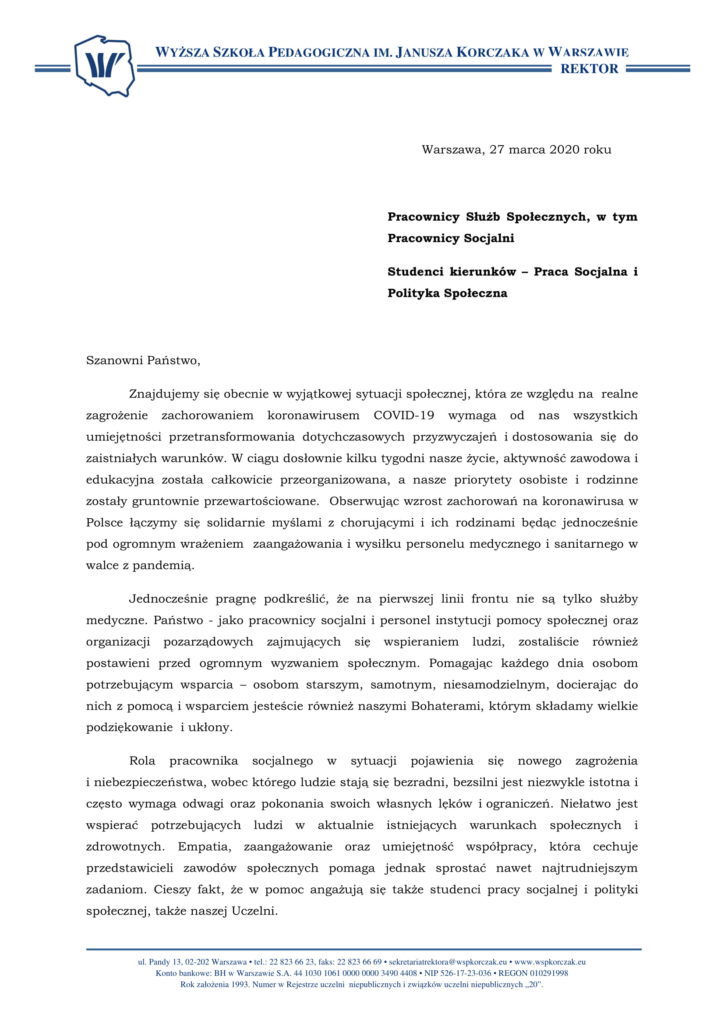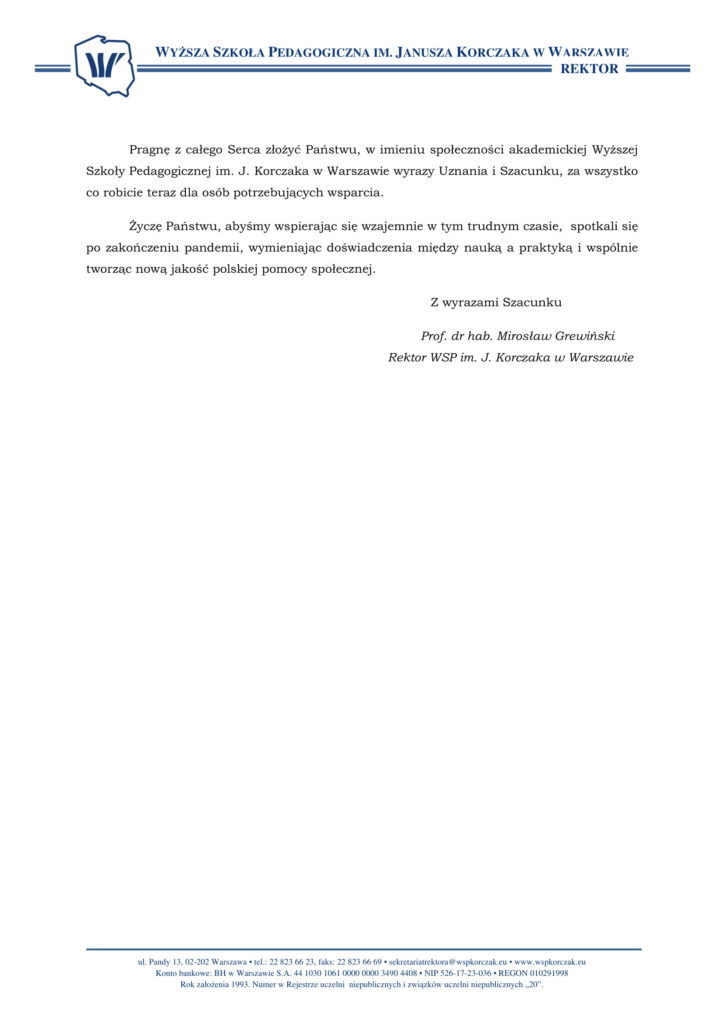 Wyższa Szkoła Pedagogiczna im. Janusza Korczaka w Warszawie ul. Pandy 13, 02-202 Warszawa zwana dalej WSP im. J. Korczaka.