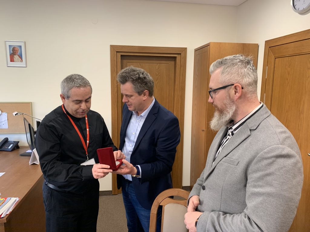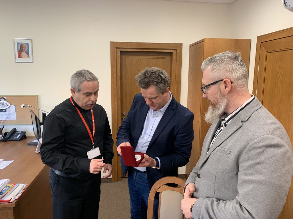 Spotkanie dotyczyło nawiązania współpracy między naszą Uczelnią a Caritas Polska – największą organizacją dobroczynną w kraju i jedną z największych na świecie. W trakcie wizyty w siedzibie organizacji prof. Mirosław Grewiński, który jednocześnie pełni funkcję Prezesa Zarządu Głównego Polskiego Towarzystwa Polityki Społecznej, wręczył ks. dr. Marcinowi Iżyckiemu medal im. Edwarda Abramowskiego – odznaczenie przyznawane przez PTPS osobom, które znacząco przyczyniły się do rozwoju kluczowych obszarów polityki społecznej.