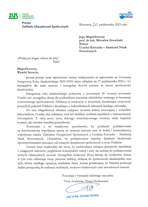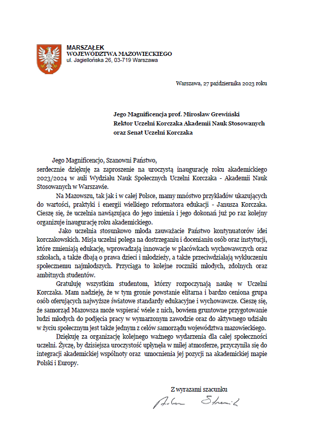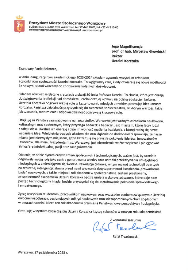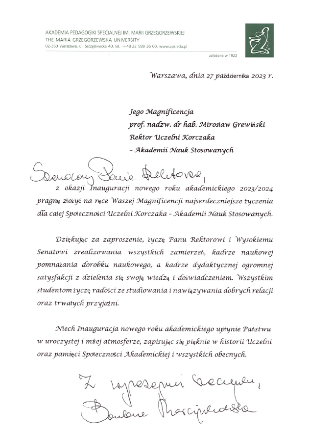 27 października w Warszawie odbyła się uroczysta Inauguracja Roku Akademickiego 2023/2024. Była to pierwsza inauguracja w Auli Wydziału Nauk Społecznych Uczelni Korczaka, nowym budynku przy ul. Lirowej 27. W swoim przemówieniu jubileuszowym, Rektor prof. Mirosław Grewiński, podsumował jubileusz 30-lecia uczelni i opowiedział o planach na najbliższą przyszłość, zaś Prorektor Uczelni Korczaka, dr Joanna Lizut, przyjęła ślubowanie od reprezentantów studentów I roku. Życzenia przesłali m.in. Marszałek Województwa Mazowieckiego Adam Struzik, Prezes ZUS prof. Gertruda Uścińska, Prezydent m. st. Warszawy Rafał Trzaskowski, Rektor APS dr hab. Barbara Marcinkowska oraz przedstawiciele struktur regionalnych Towarzystwa Wiedzy Powszechnej.